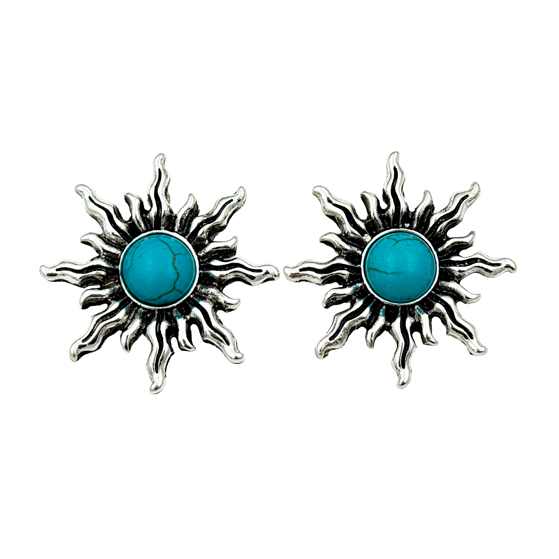Radiate timeless charm with the SreeVanna Surya Studs, inspired by the brilliance of the sun. These ethnic earrings feature a striking turquoise stone set in a detailed silver-tone sunburst design, making them a perfect blend of tradition and elegance.